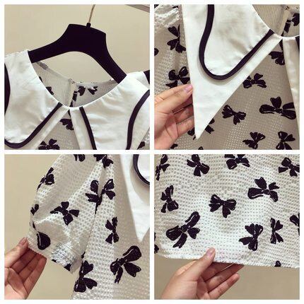 トップス ブラウス カットソー 白トップス ショート丈 袖あり 半袖 パフスリーブ 襟付き かわいい きれいめ 上品 おしゃれ ラブリー キュート ガーリー 個性的 主役級 存在感 柄 リボン柄 春 夏 10代 20代 レディース オフィス OL 通勤 学生 デート お出かけ 女子会 パーティー イベント リゾート 旅行 ガーデン レストラン 着回し 普段使い オルチャン ファッション モテ インスタ映え M L XL 2XL 3XL 4XL 大きいサイズ 白 ホワイト 黒 ブラック