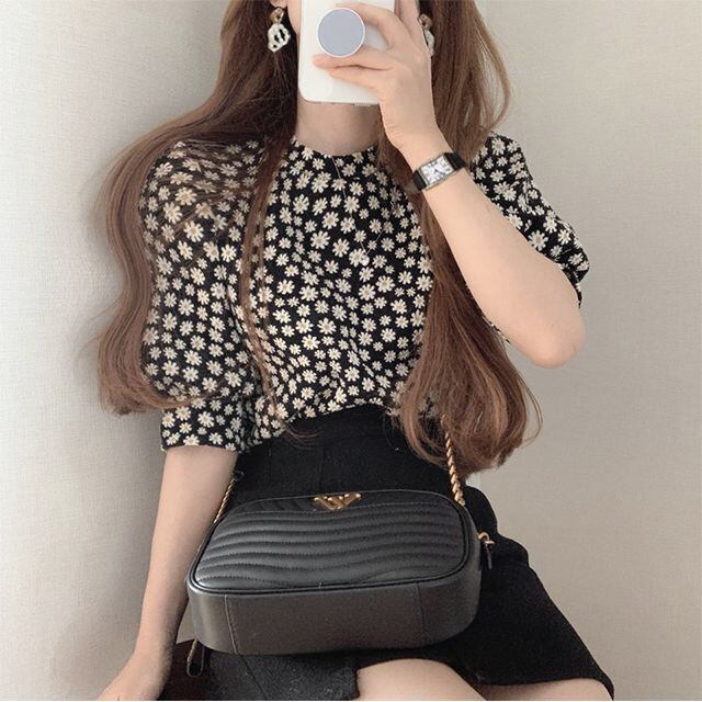 レディース トップス ブラウス パフスリーブ クルーネック 大人可愛い 花柄 韓国系 ファッション コーデ KS10031
