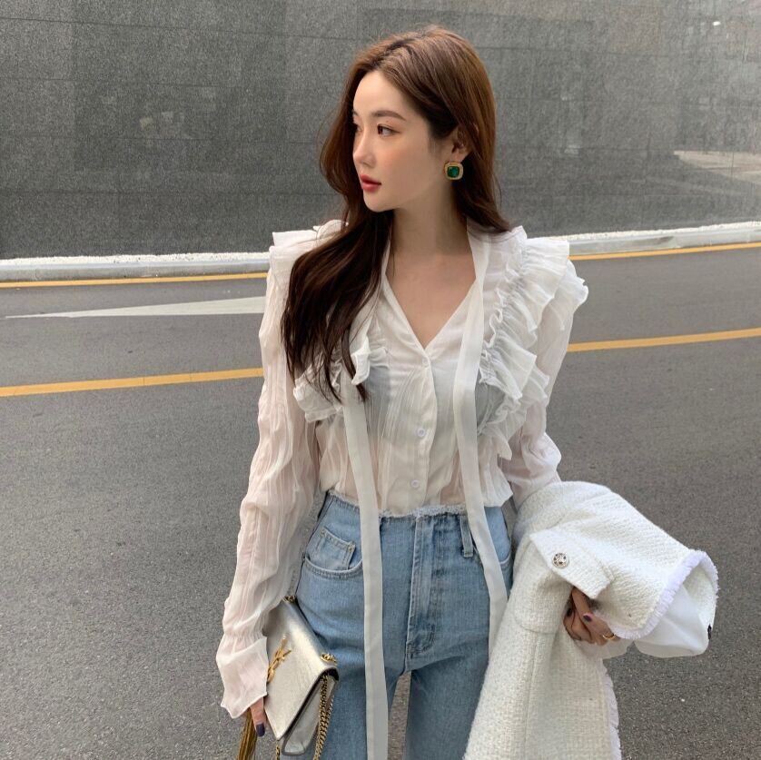 トップス シャツ ブラウス 白シャツ 白トップス 袖あり 長袖 Vネック 襟なし フリル リボン 前開き 透け感 ボタン 薄手 かわいい 大人可愛い 大人 おしゃれ お洒落 清楚 大人女子 ラブリー キュート ガーリー 存在感 爽やか 無地 春 夏 秋 ロングシーズン 10代 20代 30代 40代 レディース 女性用 ママ 女の子 学生 デート お出かけ 女子会 休日 アウトドア イベント お呼ばれ お茶会 ランチ ショッピング 着回し 普段使い 重ね着 韓国 韓国系 オルチャン フリーサイズ