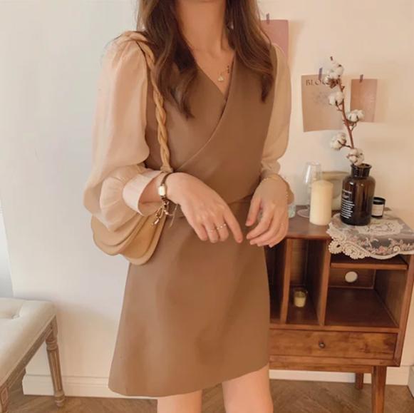大人かわいいバイカラーワンピは黒と茶色の2色展開。