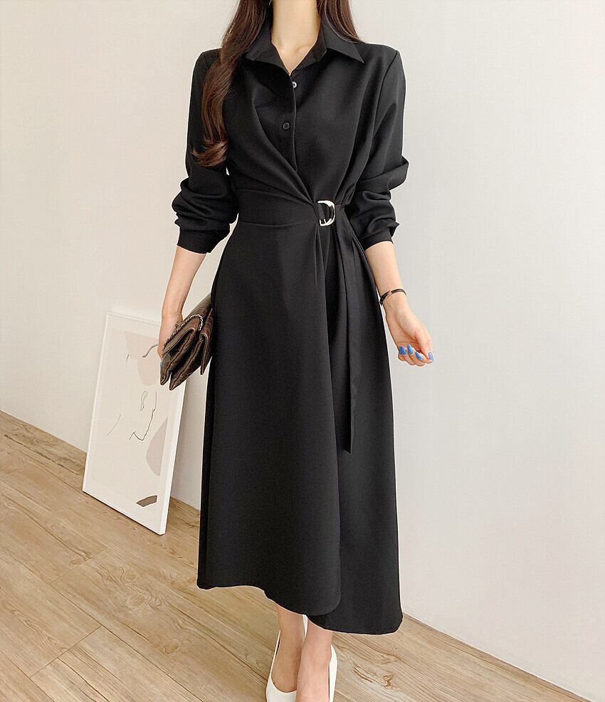 レディース ワンピース ドレープ シャツ ロング丈 長袖 ウエストベルト きれいめ シンプル 上品 お洒落 モード系 秋 KS10035