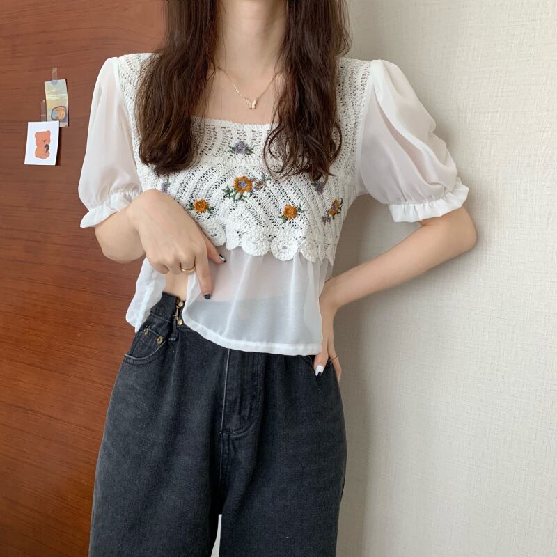 トップス ブラウス 白トップス 袖あり 半袖 パフスリーブ スクエアネック 刺繍 シフォン 切り替えデザイン 透け感 シースルー 異素材MIX かわいい 大人可愛い きれいめ おしゃれ お洒落 レトロ 大人女子 こなれ感 ラブリー キュート ガーリー 個性的 セクシー エレガント 主役級 存在感 フラワー 春 夏 10代 20代 30代 レディース 学生 通学 デート お出かけ 女子会 イベント リゾート 旅行 海 高原 ガーデン 着回し 普段使い モテ トレンド インスタ映え ホワイト アプリコット
