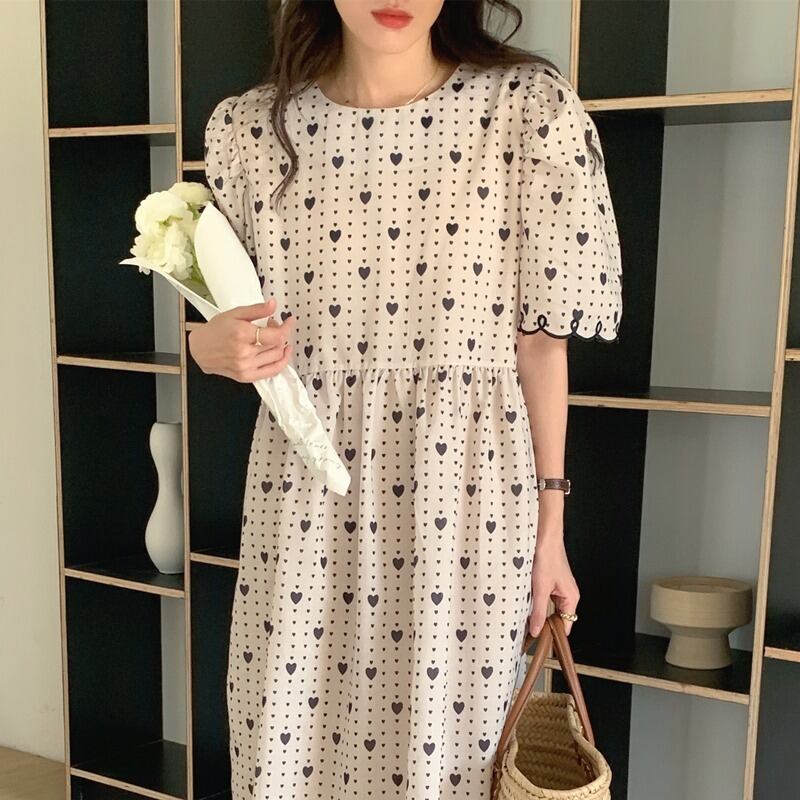 レディース ワンピース ロング丈 半袖 クルーネック ハート ドット柄 カジュアル お洒落 キュート 韓国系 ファッション コーデ KS10036
