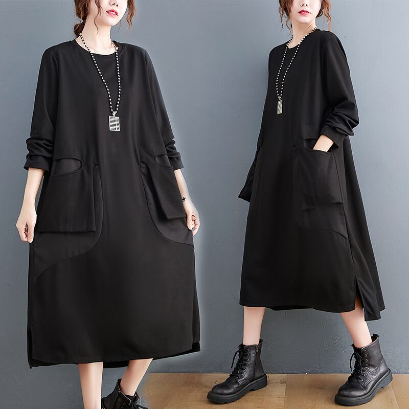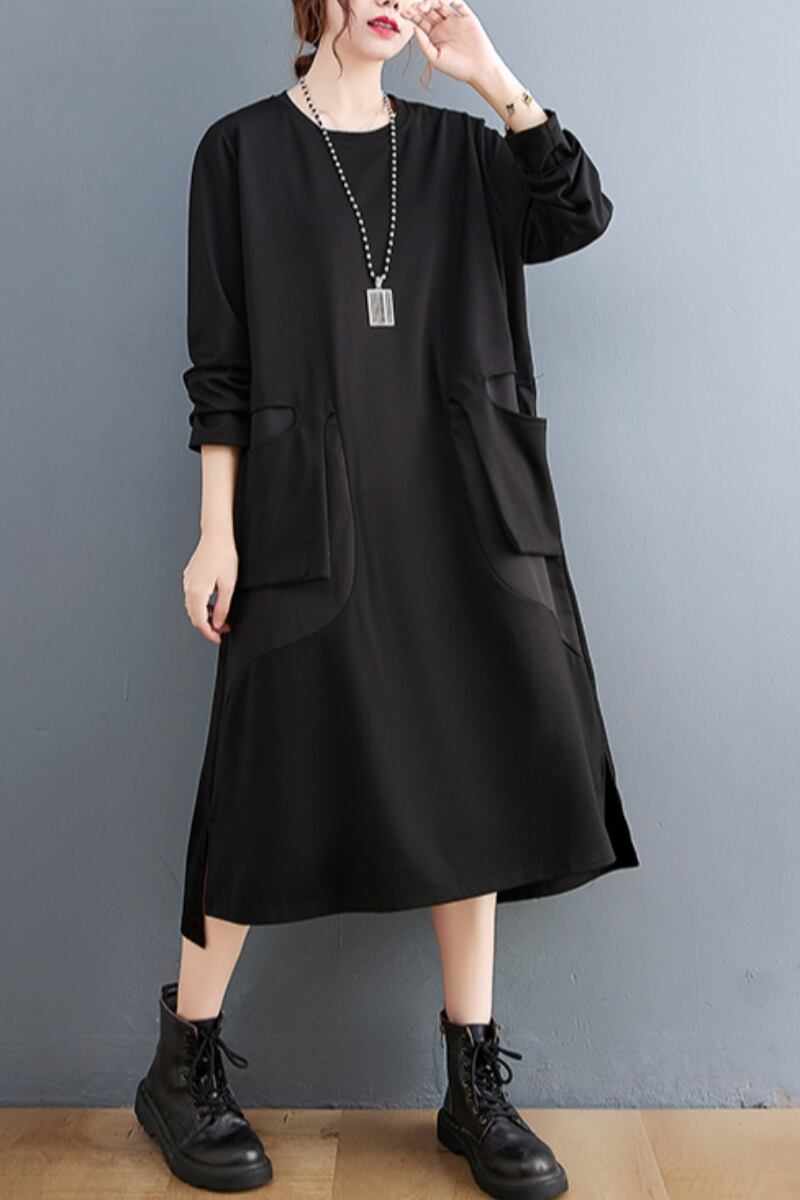 ワンピース プルオーバー ワンピドレス 膝下 ロング丈 袖あり 長袖 レギュラー袖 ラウンドネック 襟なし Aライン ポケット 伸縮性 綿 薄手 シンプル 大人 上品 おしゃれ かっこいい 大人女子 こなれ感 クール 存在感 無地 春 秋 誕生日 母の日 10代 20代 30代 40代 女性用 ママ OL 通勤 学生 通学 デート 女子会 お泊まり 休日 イベント 旅行 高原 ホテル レストラン ショッピング スタイル 楽ちん モテ 体系カバー ギフト インスタ映え ヨーロッパ L XL 大きめ 黒