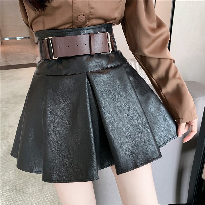 PUレザーベルト プリーツ スカート ミニ丈 フレア スリム 大人可愛い おしゃれ レトロ キュート 個性的 クール デート お出かけ 普段使い 韓国系 ファッション モテ M L XL 2XL 3XL 黒 ブラック AS10133