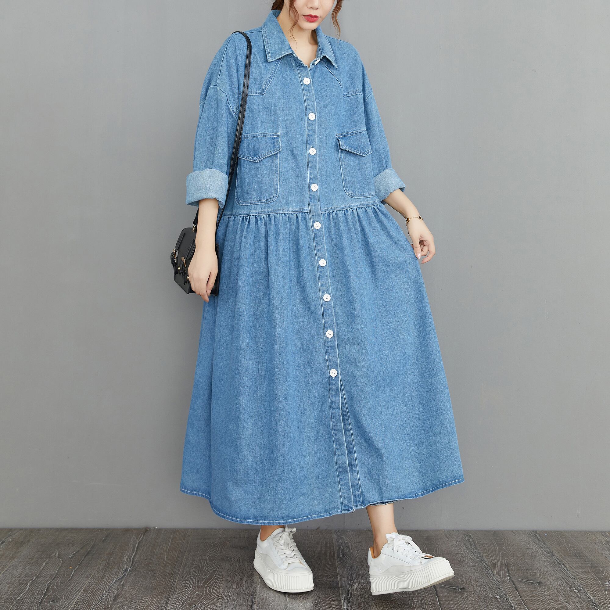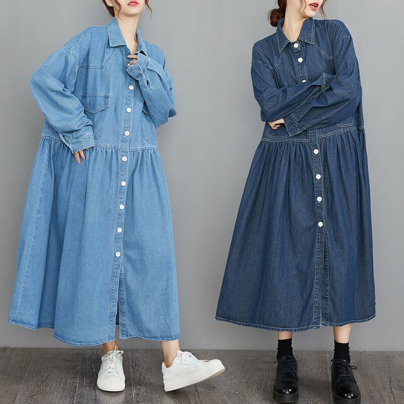 デニムワンピース ライトブルー ダークブルー 大きいサイズ トップス ワンピース シャツ ロングワンピース 膝下 ロング ロング丈 袖あり 長袖 襟付き ウエストマーク ポケット 前開き ボタン デニム ブルーデニム かわいい シンプル カジュアル おしゃれ お洒落 ラフ ガーリー 個性的 存在感 爽やか スマート 無地 春 秋 冬 ロングシーズン 10代 20代 30代 レディース 女性用 学生 デート お出かけ 公園 女子会 アウトドア ランチ ショッピング 着回し 普段使い L XL ゆったり