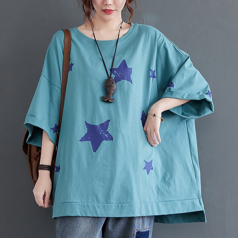 トップス Tシャツ プルオーバー レギュラー丈 袖あり レギュラー袖 ラウンドネック 襟なし ワイド 綿 薄手 コットン かわいい 大人可愛い カジュアル お洒落 こなれ感 ラフ ラブリー キュート ルーズ 抜け感 柄 プリント 星柄 夏 誕生日 10代 20代 30代 レディース ママ 通勤 学生 通学 デート お出かけ 公園デビュー 女子会 お泊まり 休日 運動 アウトドア イベント 旅行 海 プール 高原 ショッピング 普段使い 楽ちん モテ 体系カバー プレゼント L XL ゆる 黒 青