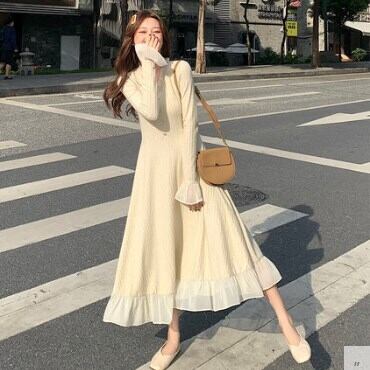 袖・裾のフリルがフェミニンで可愛いニットワンピース。