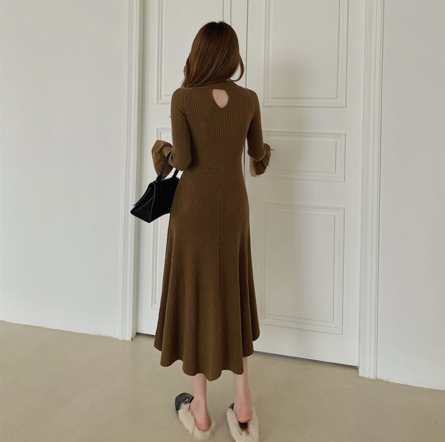 ワンピース 膝下 ミモレ丈 袖あり 長袖 フレアスリーブ 萌袖 襟なし ハイネック Aライン リブ 2way かわいい 大人可愛い 大人 上品 おしゃれ 大人女子 こなれ感 ラブリー セクシー エレガント 主役級 存在感 とろみ感 抜け感 無地 秋 冬 クリスマス バレンタイン 10代 20代 30代 レディース ママ OL 通勤 学生 通学 女子会 お泊まり 休日 パーティー イベント 旅行 着回し 普段使い ファッション モテ 美脚 ギフト S M L ブラック レッド キャメル カラバリ 大人カラー