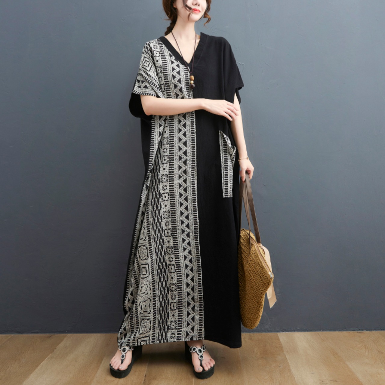 ワンピース ロングワンピース 膝下 ミモレ丈 袖あり 半袖 Vネック 襟なし ワイド Iライン 大人可愛い シンプル カジュアル 大人 お洒落 大人女子 こなれ感 ラフ ガーリー ルーズ 個性的 主役級 抜け感 柄 春 夏 秋 20代 30代 40代 ママ 通学 デート お出かけ 女子会 休日 旅行 着回し 普段使い 重ね着 楽ちん 暖かい 体系カバー ギフト トレンド 流行 インスタ映え サイズ 大きいサイズ ゆったり バイカラー