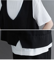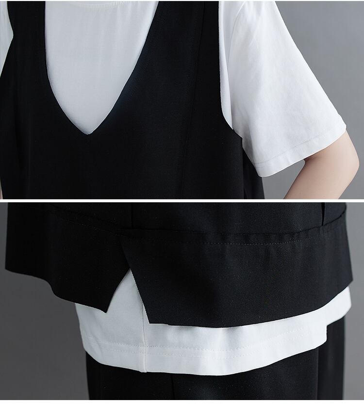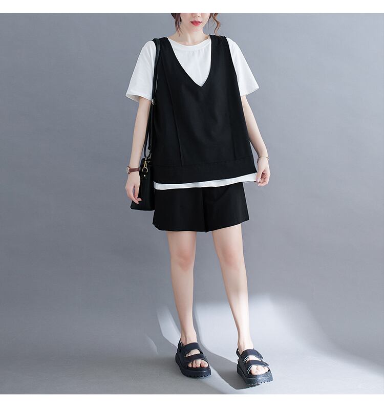 大きいサイズ展開のTシャツとベスト、パンツの3点セット。