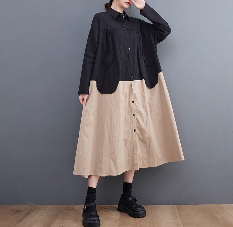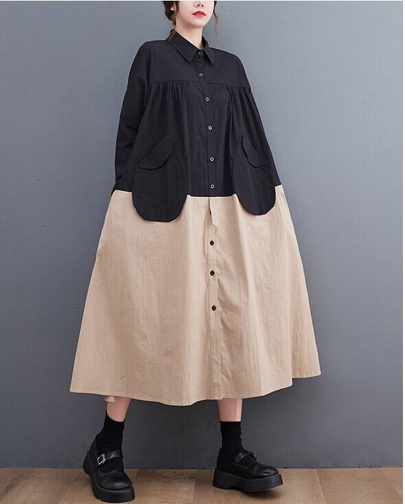 シャツ ワンピース ロングスカート シャツワンピース ミモレ丈 ロング丈 長袖 襟付き ワイド Aライン 切り替えデザイン ポケット 前開き かわいい 大人可愛い シンプル カジュアル 大人 おしゃれ レトロ 大人女子 こなれ感 ラフ ルーズ 個性的 モード系 抜け感 無地 春 秋 10代 20代 30代 レディース ママ マタニティ 学生 通学 デート お出かけ 公園デビュー 女子会 休日 着回し 普段使い 楽ちん モテ 体系カバー 大きいサイズ 大きめ ゆったり ゆる ワンサイズ 色展開 黒 カーキ