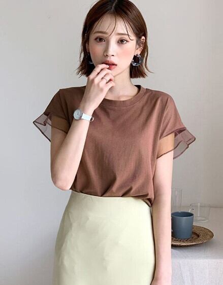 フリル トップス Tシャツ シャツ カットソー 白シャツ 白トップス 半袖 フレアスリーブ Uネック ラウンドネック ストレート 透け感 シースルー かわいい 大人可愛い きれいめ シンプル カジュアル 大人 上品 おしゃれ 大人女子 こなれ感 ラフ ラブリー キュート ガーリー クール 存在感 とろみ感 抜け感 無地 夏 10代 20代 30代 レディース OL 通勤 学生 通学 デート お出かけ 女子会 着回し 普段使い モテ サイズ M L 色展開 白 ホワイト 黒 ブラック 茶色 ブラウン ピンク