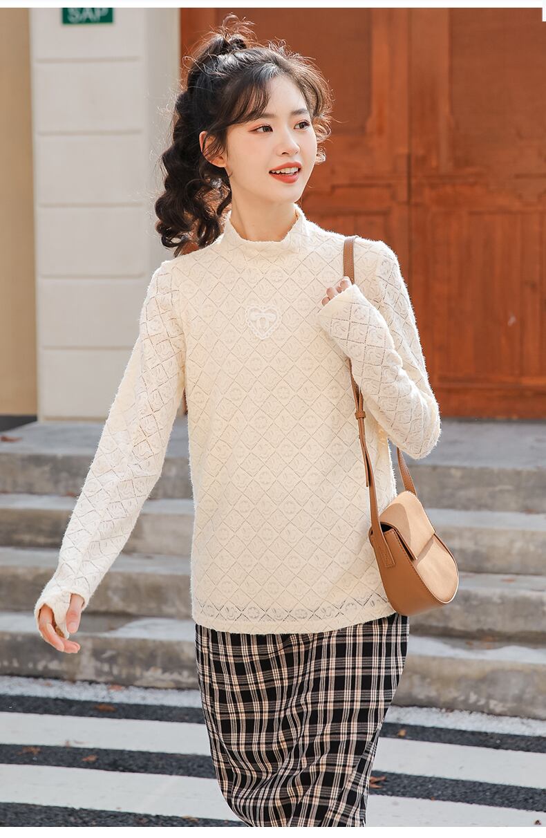 ガーリートップス アプリコット トップス シャツ カットソー 袖あり 長袖 ハイネック 襟なし レース 刺繍 かわいい 大人可愛い おしゃれ お洒落 ラブリー キュート ガーリー 存在感 無地 春 秋 冬 ロングシーズン 10代 20代 30代 レディース 女性用 女の子 学生 デート お出かけ 女子会 休日 お茶会 ランチ ショッピング 着回し 普段使い 重ね着 韓国 韓国系 オルチャン モテ プチプラ 安い インスタ映え 二の腕カバー 華奢見え S M L ガーリーコーデ ハイネックトップス 萌え袖