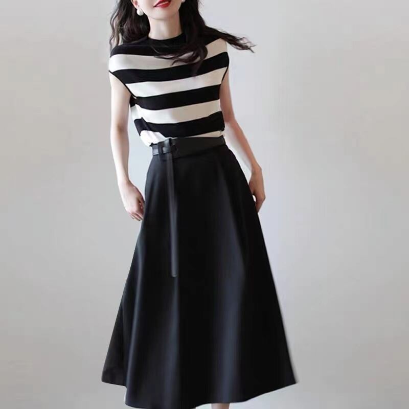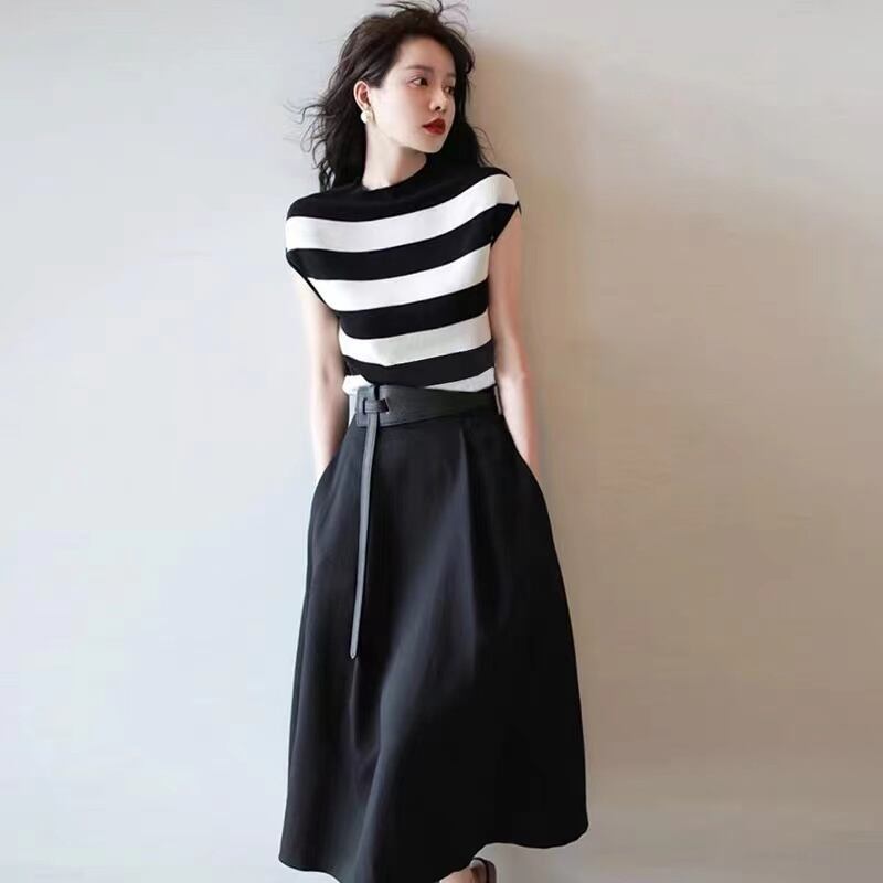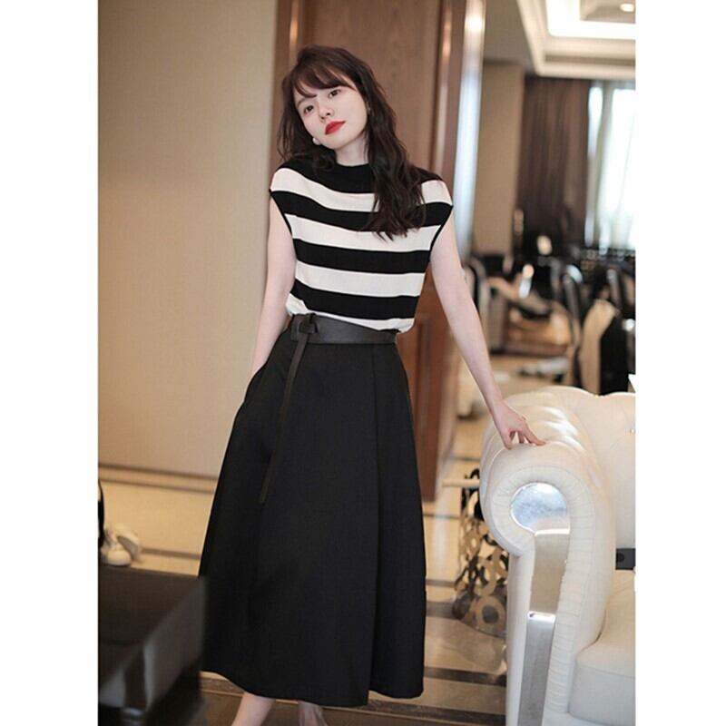 色展開 ボーダートップス+黒スカート(ベルト付)
