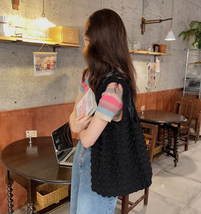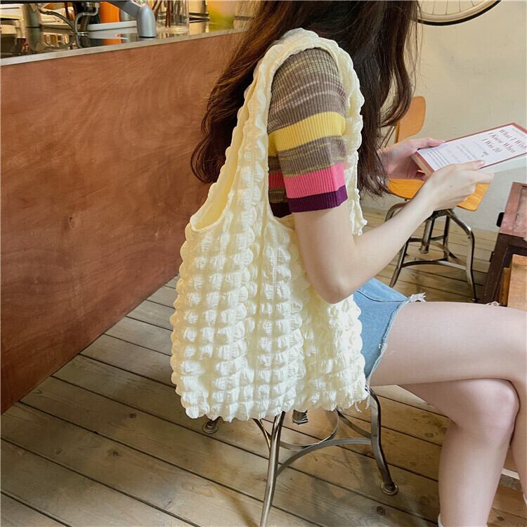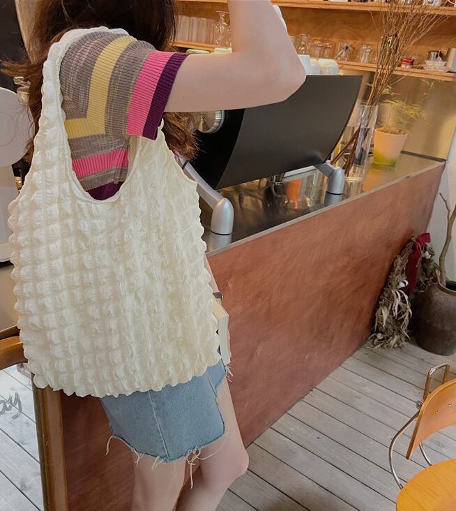 ワッフル トートバッグ バッグ 大容量 肩がけ ポリエステル かわいい おしゃれ こなれ感 キュート ガーリー デイリー 普段使い 黒 ブラック アイボリー AS10171