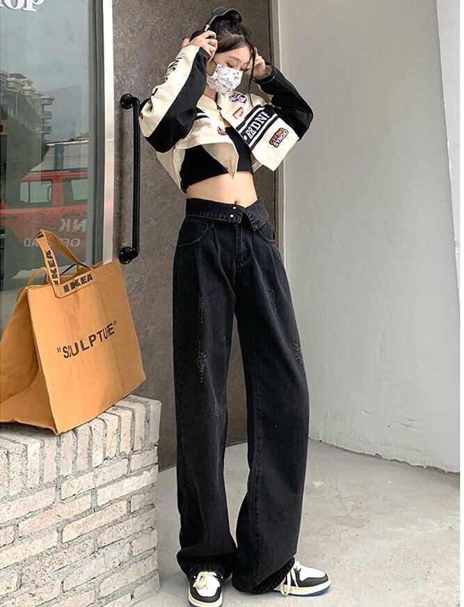 全体的にゆったりとしたシルエットのストレートデニムは、華奢見せ効果も。