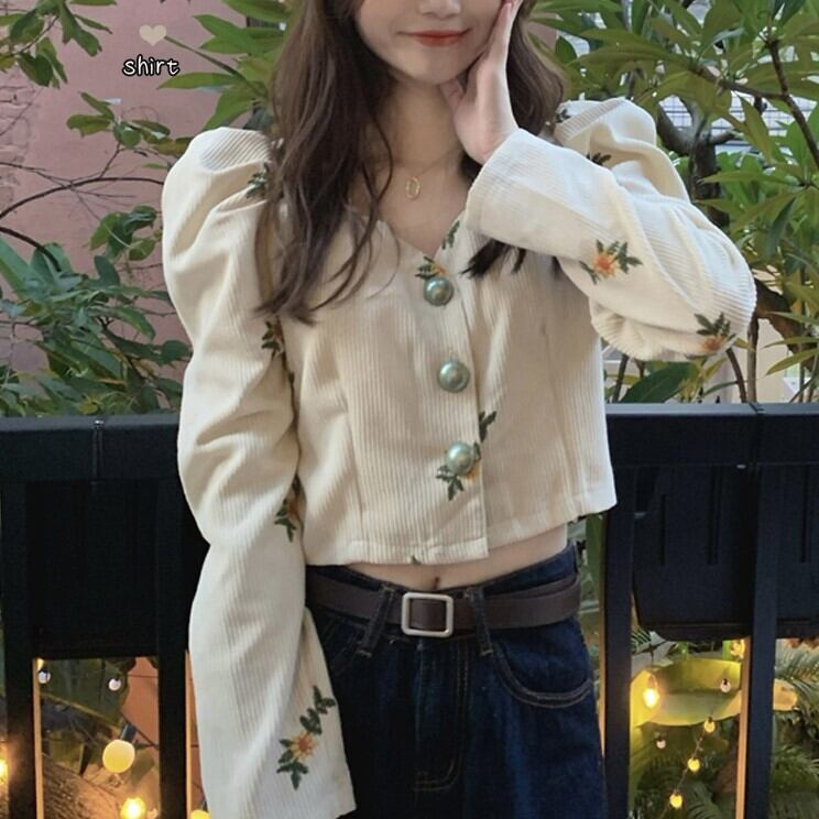 刺繍 コーデュロイ トップス カットソー 白トップス ショート ショート丈 長袖 パフスリーブ Vネック スリム ストレート ベロア かわいい 大人可愛い きれいめ シンプル カジュアル 大人 上品 おしゃれ レトロ エキゾチック 大人女子 こなれ感 ラフ ラブリー キュート ガーリー 個性的 主役級 存在感 とろみ感 抜け感 花柄 フラワー ボタニカル 秋 冬 10代 20代 レディース 学生 通学 デート お出かけ 女子会 休日 着回し 普段使い モテ フリーサイズ 色展開 白 ホワイト 黒 ブラック