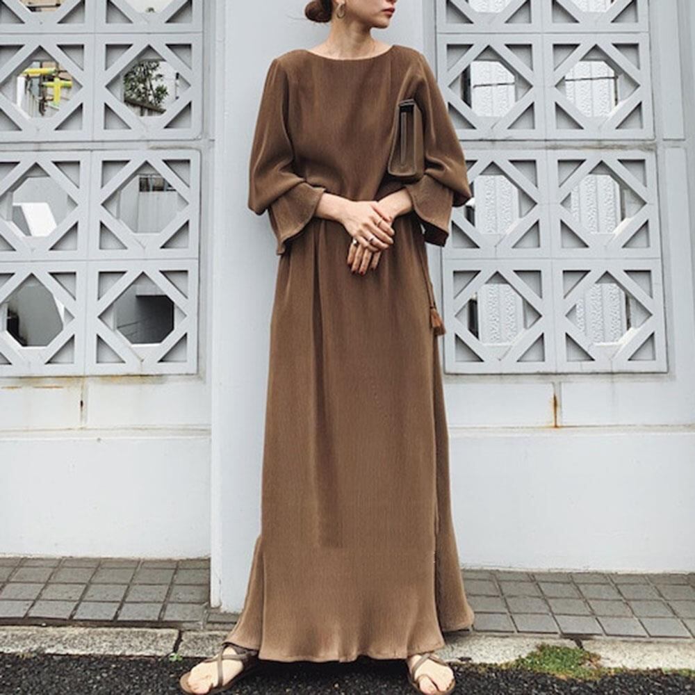 ワンピース プルオーバー 袖あり 長袖 ボリューム袖 トランペットスリーブ ラウンドネック 襟なし ワイド プリーツ ベロア 大人可愛い きれいめ シンプル カジュアル 大人 上品 お洒落 レトロ 大人女子 こなれ感 ラフ エレガント 主役級 抜け感 無地 秋 冬 20代 30代 40代 ママ 通勤 通学 デート お出かけ 女子会 休日 旅行 着回し 普段使い 重ね着 楽ちん 暖かい 体系カバー 定番 トレンド 流行 インスタ映え ワンサイズ ゆったり ブラウン
