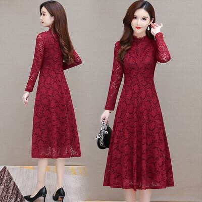 レースワンピース ブラック バーガンディ ワンピース ドレス パーティードレス 膝丈ドレス ワンピースドレス ワンピドレス 膝丈 ひざ丈 袖あり 長袖 襟付き スタンドカラー Aライン レース ウエストマーク ハイウエスト 透け感 シースルー かわいい 大人可愛い きれいめ 大人 おしゃれ お洒落 大人女子 ラブリー キュート ガーリー 存在感 華やか お嬢様 清楚 柄 花柄 小花柄 10代 20代 30代 40代 レディース 女性用 デート パーティー イベント ホテル レストラン お呼ばれ 美脚