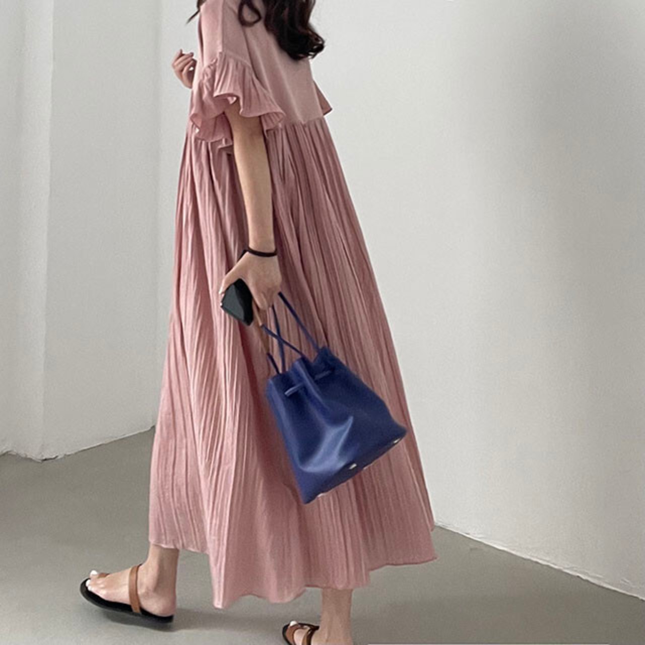プリーツ フリル ワンピース ロングスカート フレアワンピース ワンピドレス ロング丈 マキシ丈 半袖 フレアスリーブ ラウンドネック フレア ワイド Aライン 切り替えデザイン かわいい 大人可愛い シンプル カジュアル おしゃれ レトロ 大人女子 こなれ感 ラフ ルーズ 個性的 主役級 存在感 とろみ感 抜け感 無地 夏 10代 20代 30代 レディース ママ マタニティ 学生 デート お出かけ 女子会 休日 着回し 普段使い 韓国系 ファッション 楽ちん フリーサイズ 色展開 黒 ベージュ ピンク