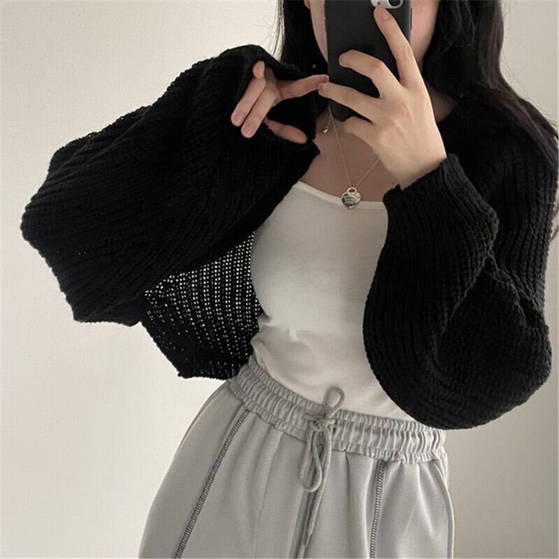 ボタンが無くさっと羽織れるボレロニットカーディガン。
