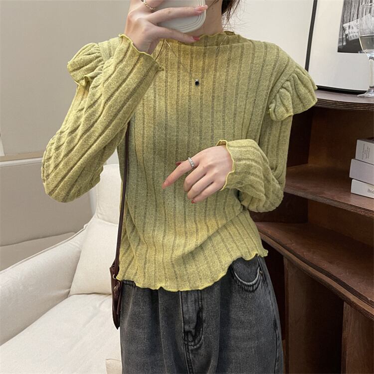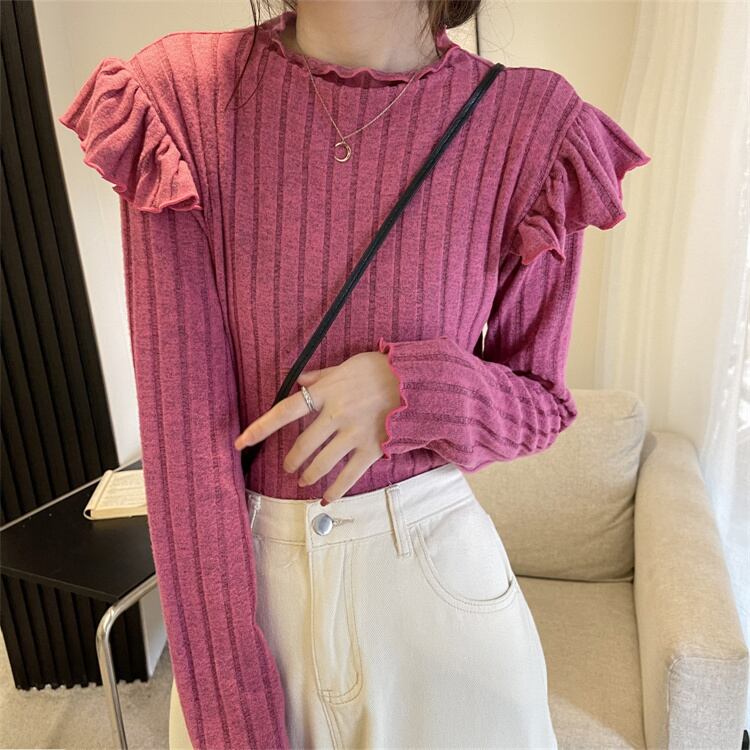 長袖ニットセーター フリル トップス セーター プルオーバー ショート ショート丈 袖あり 長袖 Uネック 襟なし スリム タイト ストレート スマート フリル 伸縮性 ニット かわいい 大人可愛い きれいめ シンプル カジュアル 大人 上品 おしゃれ お洒落 大人可愛い 大人女子 こなれ感 ラブリー キュート ガーリー 個性的 エレガント 主役級 存在感 ストライプ 春 秋 冬 10代 20代 30代 40代 レディース 女性用 ママ オフィス ビジネス OL 通勤