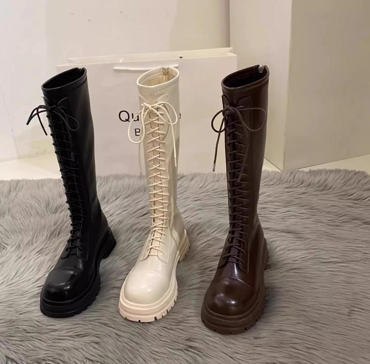 レディース レースアップ ロングブーツ エナメル 編み上げ 厚底 PU ブラック ベージュ ブラウン AS10208