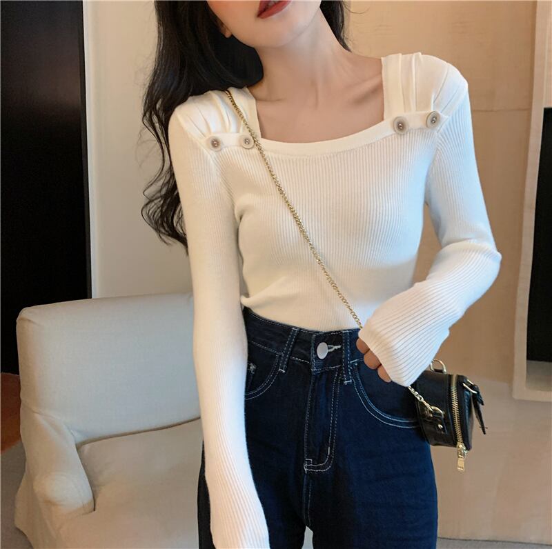 シンプルなリブニットに胸元の大きく開いたスクエアネックで抜け感をプラス。