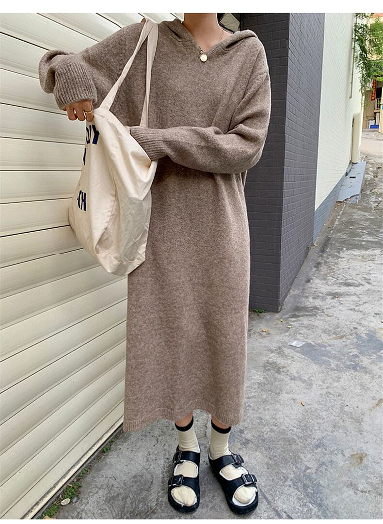 フード付き ニット ワンピース ニットソー セーター フーディー ワンピドレス ロング ロング丈 長袖 ストレート ワイド かわいい 大人可愛い シンプル カジュアル 大人 おしゃれ お洒落 大人女子 こなれ感 ラフ キュート ルーズ 個性的 存在感 抜け感 無地 秋 冬 10代 20代 30代 ママ 学生 通学 デート お出かけ 女子会 休日 着回し 普段使い 韓国系 ファッション 楽ちん 暖かい モテ 体系カバー サイズ S M L ゆったり ゆる 色展開 白 ホワイト 茶色 ブラウン 灰色 グレー