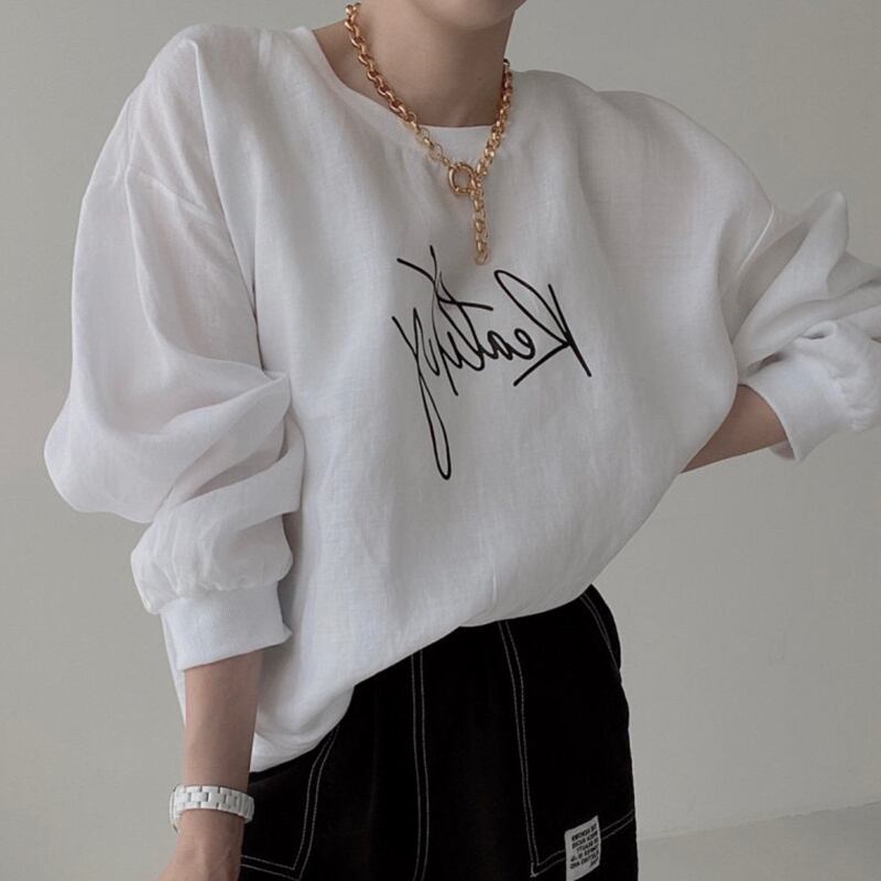 トップス プルオーバー トレーナー 長袖 パフスリーブ ラウンドネック かわいい 大人可愛い シンプル カジュアル 大人 おしゃれ お洒落 かっこいい 大人女子 こなれ感 ラフ メンズライク マニッシュ ボーイッシュ スポーティー ルーズ 存在感 抜け感 無地 プリント 春 秋 10代 20代 30代 学生 通学 お出かけ 公園デビュー お泊まり 休日 着回し 普段使い 楽ちん モテ 体系カバー サイズ M L XL 2XL 色展開 ホワイト グレー ピンク ブラック