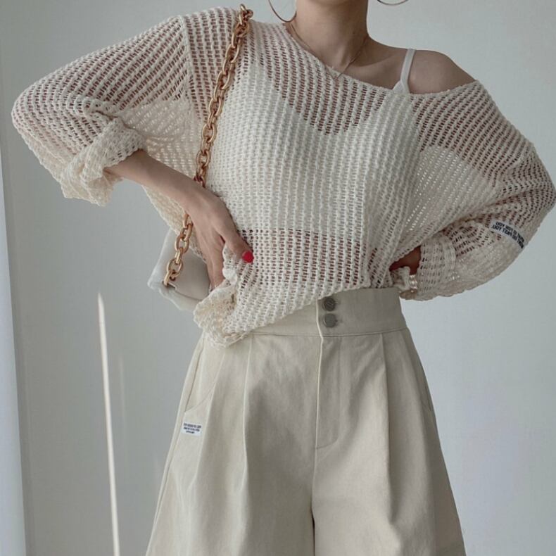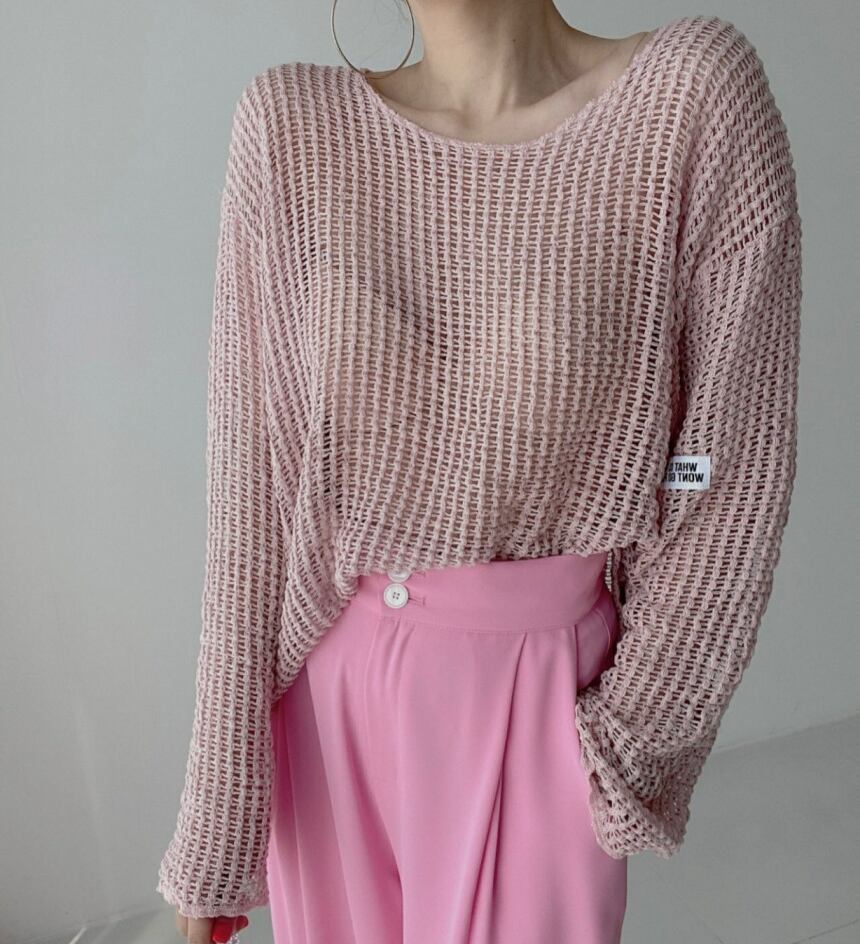 透かし編み ニット トップス ニットソー 長袖 綿 きれいめ シンプル おしゃれ 大人女子 こなれ感 セクシー 抜け感 春 夏 デート お出かけ リゾート 海 韓国系 ファッション フリーサイズ ゆったり 白 ホワイト 黒 ブラック 青 ブルー 茶色 ブラウン ピンク AS10216