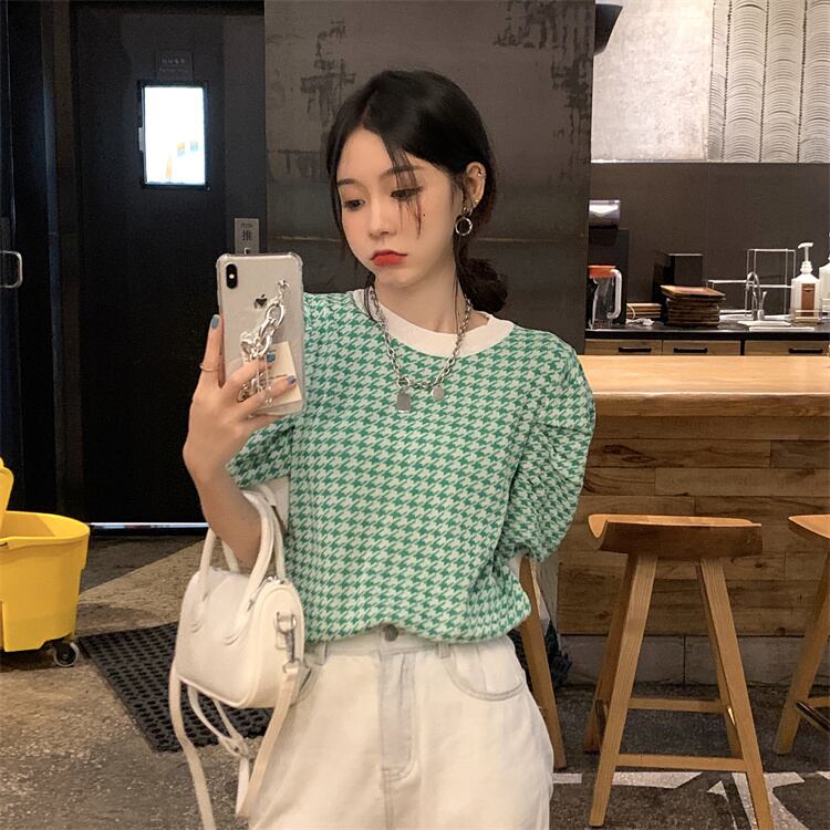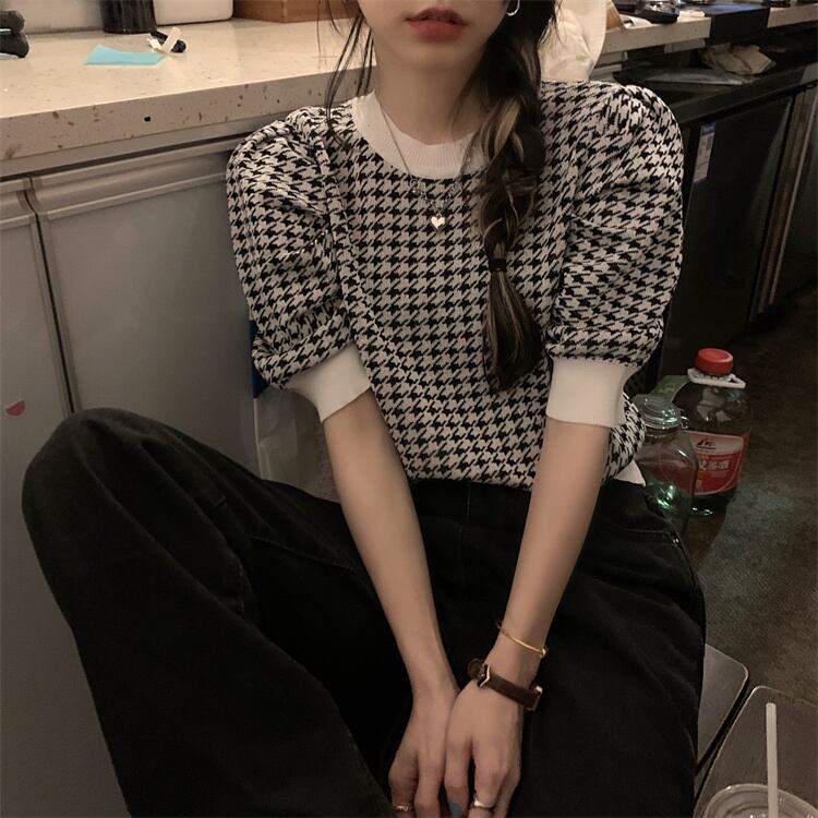千鳥格子 サマーニット Tシャツ ニット トップス シャツ カットソー ニットソー ショート丈 半袖 パフスリーブ ラウンドネック クルーネック かわいい 大人可愛い きれいめ カジュアル 大人 上品 おしゃれ レトロ 大人女子 こなれ感 ラブリー キュート ガーリー 個性的 存在感 とろみ感 抜け感 格子縞 春 夏 10代 20代 30代 レディース OL 通勤 学生 通学 デート お出かけ 公園デビュー 女子会 休日 着回し 普段使い 重ね着 モテ フリーサイズ 色展開 黒 ブラック 緑 グリーン