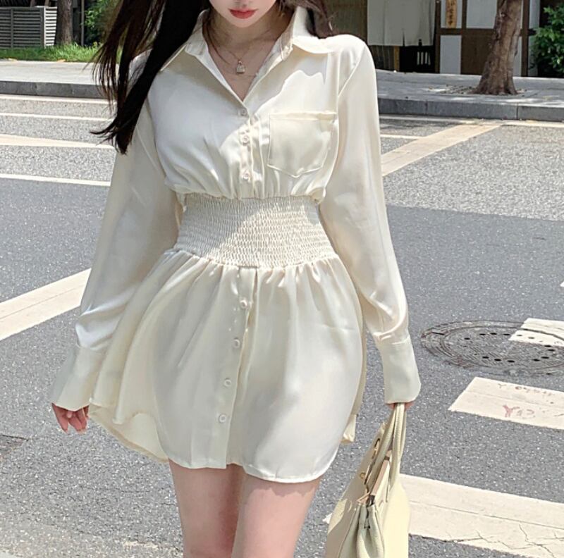 ウエストシャーリング シャツ ワンピース ミニ丈 長袖 Vネック 襟付き フレア きれいめ シンプル 上品 おしゃれ 大人可愛い こなれ感 セクシー デート お出かけ 着回し 普段使い 韓国系 ファッション 美脚 脚長 S M AS10239