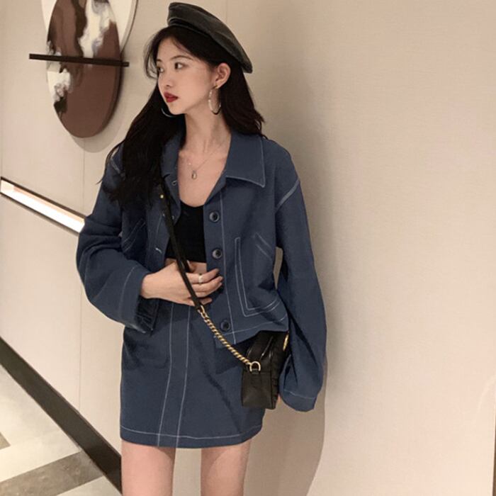ジャケット スカート セットアップ 2点セット ミニ丈 ショート丈 長袖 カジュアル おしゃれ かっこいい こなれ感 主役級 通勤 通学 普段使い 韓国系 ファッション 楽ちん S M L XL 2XL 青 ブルー AS10244