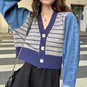 ニット デニム トップス ニットソー セーター ショート丈 長袖 ドッキング カジュアル おしゃれ 大人可愛い こなれ感 ガーリー 通勤 通学 お出かけ 着回し 普段使い フリーサイズ ゆる 青 ブルー AS10249