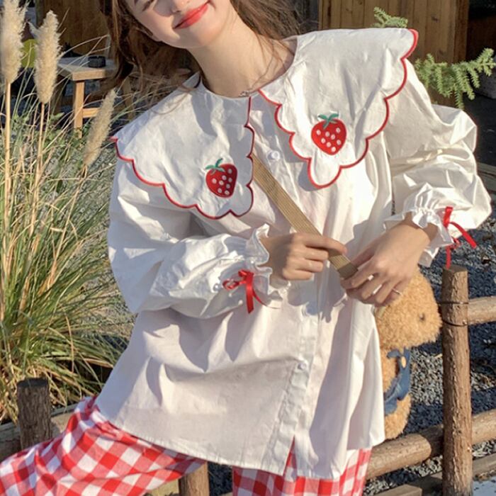 ストロベリー 苺 刺繍 ブラウス トップス 長袖 かわいい おしゃれ レトロ ラフ ラブリー キュート ガーリー 個性的 お出かけ 着回し 普段使い フリーサイズ ゆったり 白 ホワイト AS10267