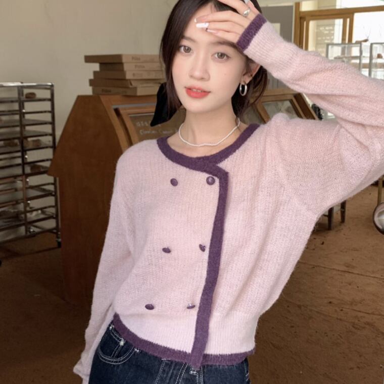 ダブルボタン ニット 透け感 カーディガン 薄手 トップス 長袖 きれいめ 上品 おしゃれ レトロ こなれ感 個性的 春 通勤 通学 お出かけ 着回し 普段使い 韓国系 ファッション 楽ちん 体系カバー S M L XL 白 ホワイト 紫 パープル 茶色 ブラウン AS10274