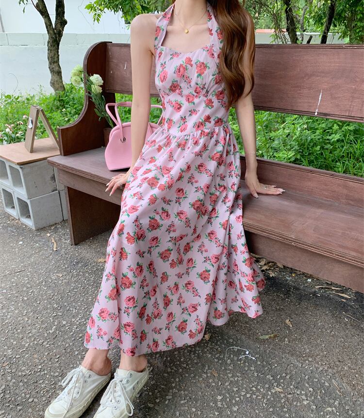 ホルターネック 薔薇 花柄 ワンピース ロング丈 マキシ丈 袖なし ノースリーブ フレア かわいい 上品 おしゃれ 大人可愛い ラブリー キュート デート お出かけ パーティー リゾート 海 モテ 体系カバー フリーサイズ ピンク AS10288