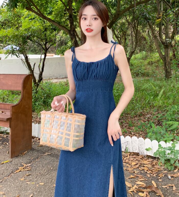 デニム キャミソール ワンピース スリット ロング丈 きれいめ カジュアル おしゃれ こなれ感 セクシー オールシーズン お出かけ リゾート 着回し 普段使い 体系カバー M L XL 2XL 3XL 4XL 青 ブルー AS10293