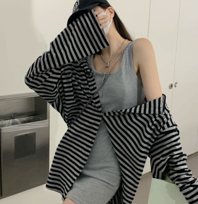 ボーダー カーディガン トップス 長袖 カジュアル おしゃれ こなれ感 ラフ メンズライク 通勤 通学 着回し 普段使い 重ね着 モテ 体系カバー フリーサイズ モノトーン AS10294