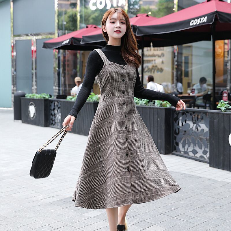 チェック柄ワンピース ジャンバースカート ロング丈 Aライン きれいめ カジュアル おしゃれ こなれ感 セクシー かわいい 大人かわいい 秋 冬 お出かけ デート リゾート 着回し 普段使い 体系カバー 10代 20代 30代 通学 S M L XL