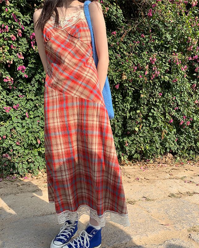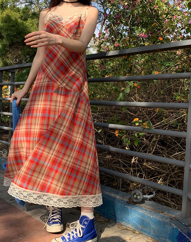 チェック柄 レース キャミソール ワンピース ロング丈 きれいめ カジュアル おしゃれ アジアン こなれ感 ラフ キュート 春 夏 リゾート 海 普段使い 楽ちん 体系カバー S M 赤 レッド AS10305