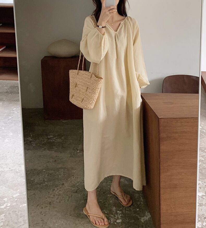 ガーゼ コットン 薄手 長袖 ワンピース ロング丈 フレア シンプル こなれ感 ラフ お出かけ 休日 リゾート 体系カバー フリーサイズ 黒 ブラック 青 ブルー 紫 パープル アイボリー AS10324