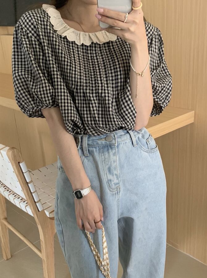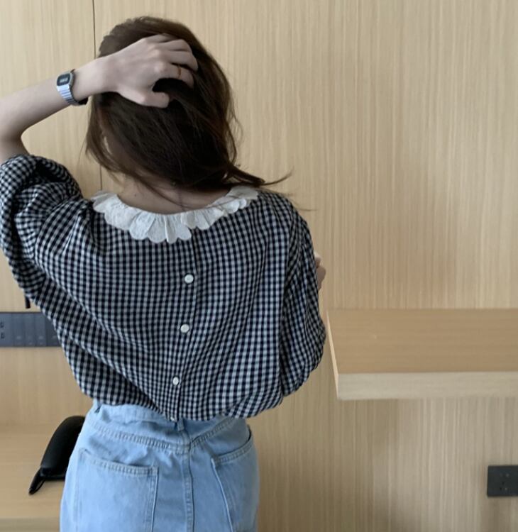 バックボタン ギンガムチェック シャツ トップス ブラウス 半袖 かわいい おしゃれ レトロ 大人可愛い ガーリー 春 夏 通勤 通学 お出かけ 着回し 普段使い フリーサイズ モノトーン AS10329