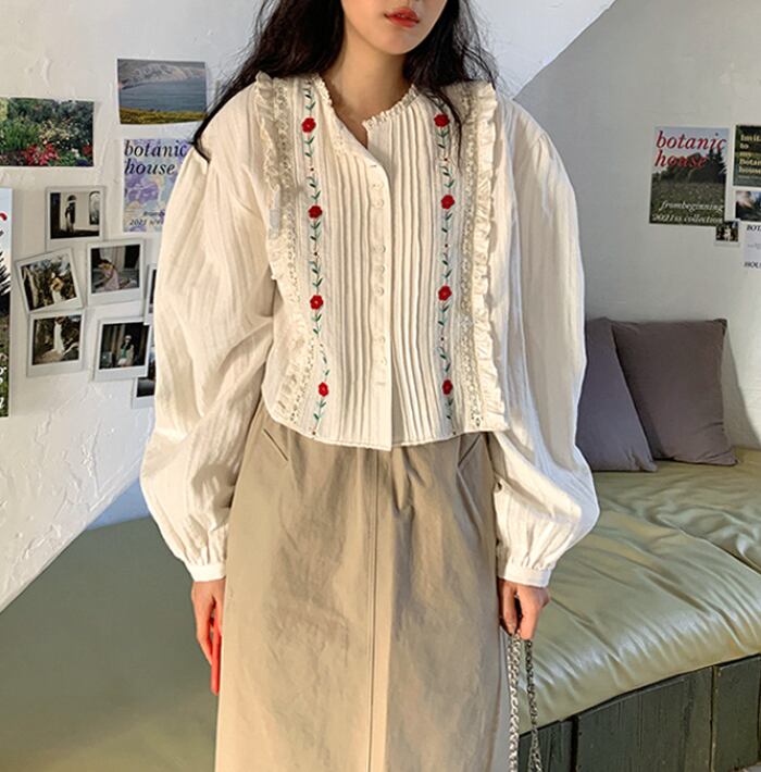 花柄 刺繍 パフスリーブ ブラウス レトロ 長袖 トップス フリル かわいい おしゃれ ラブリー キュート ガーリー 通勤 通学 お出かけ 着回し 普段使い 重ね着 フリーサイズ 白 ホワイト 黒 ブラック AS10332