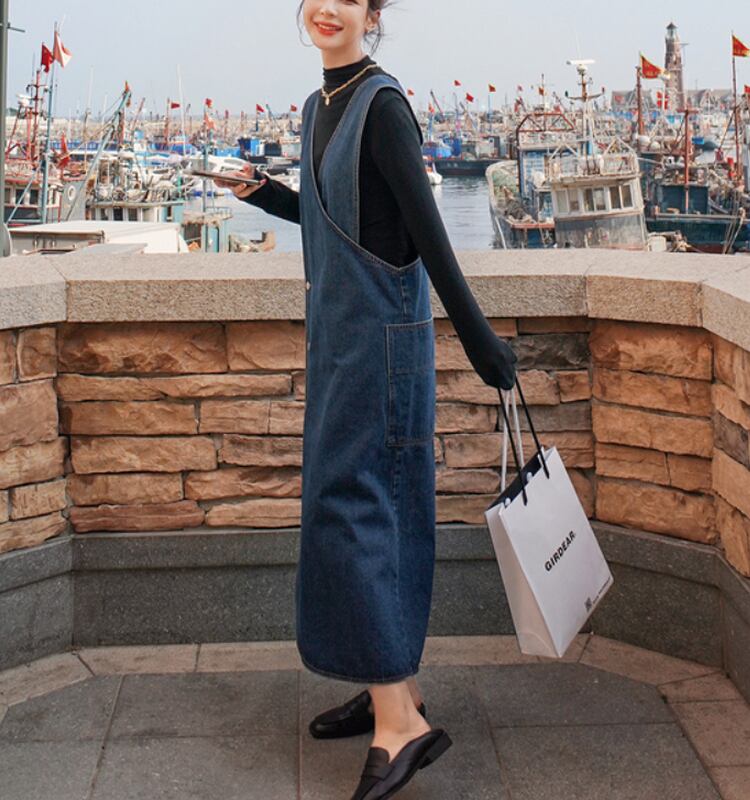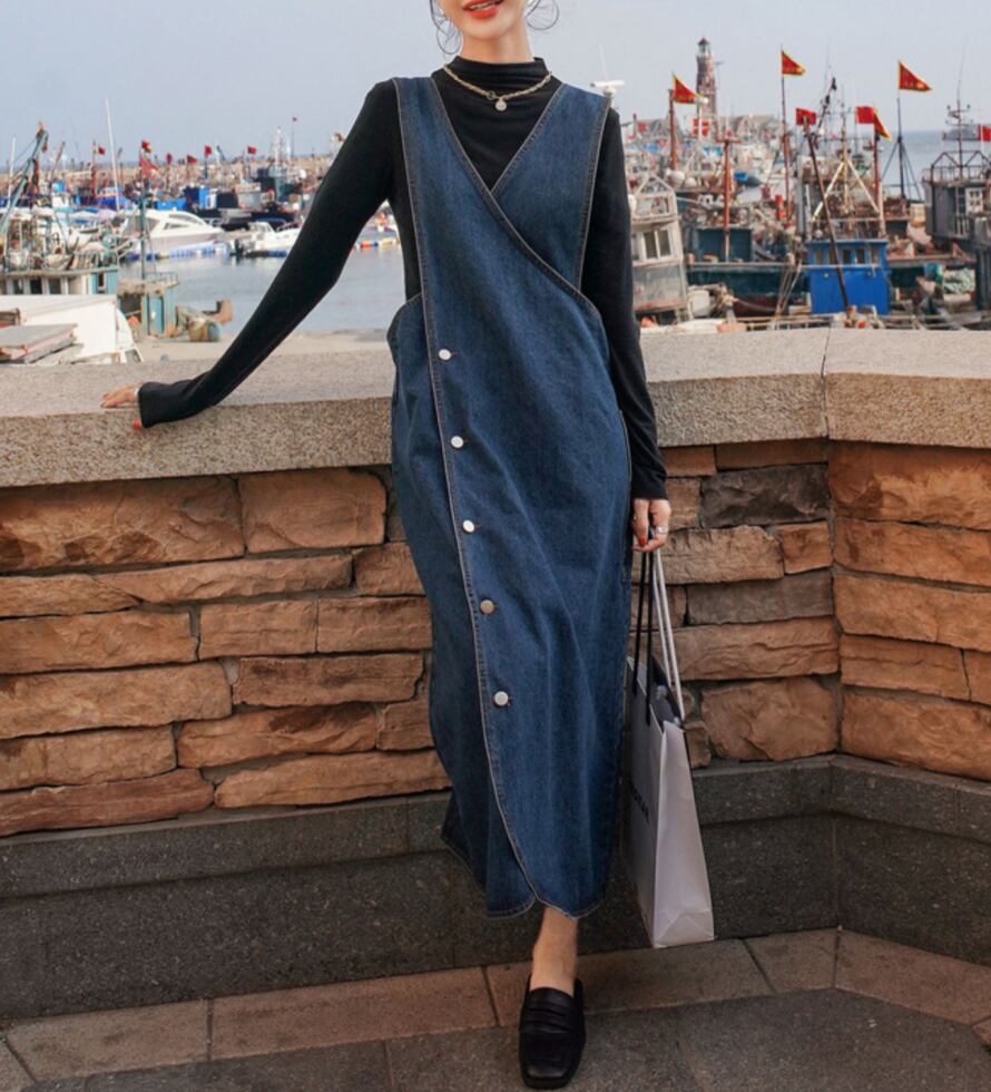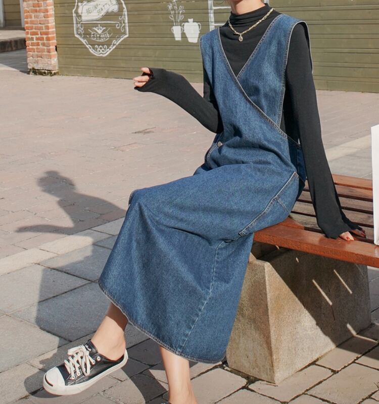 デニム ジャンパースカート Vネック ロング丈 シンプル カジュアル おしゃれ こなれ感 ラフ キュート オールシーズン 通勤 通学 お出かけ アウトドア 旅行 着回し 普段使い 重ね着 体系カバー S M L 青 ブルー AS10337