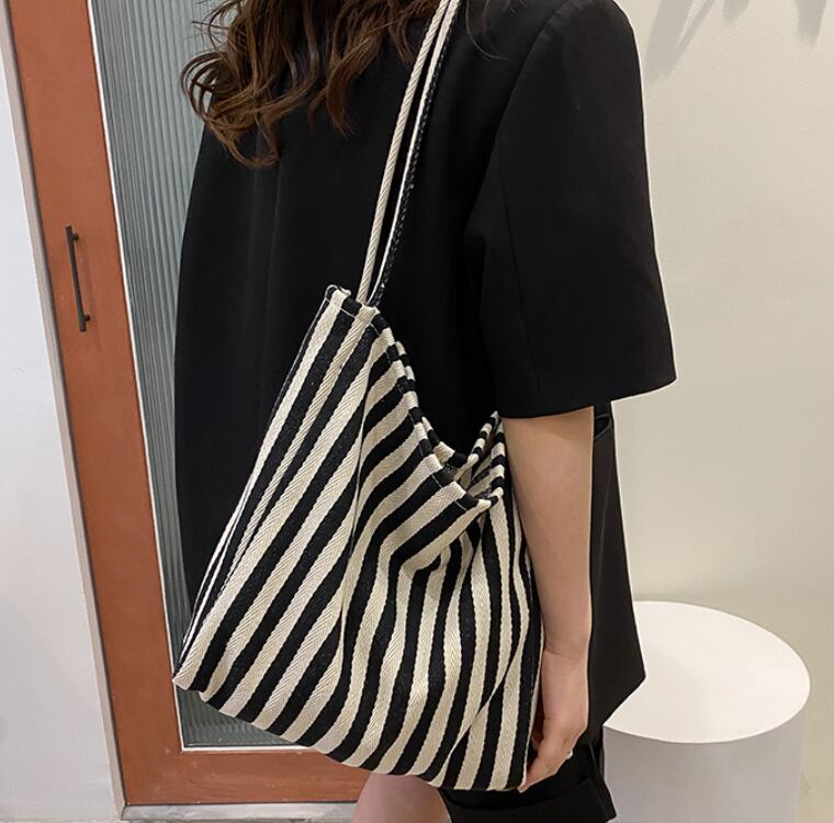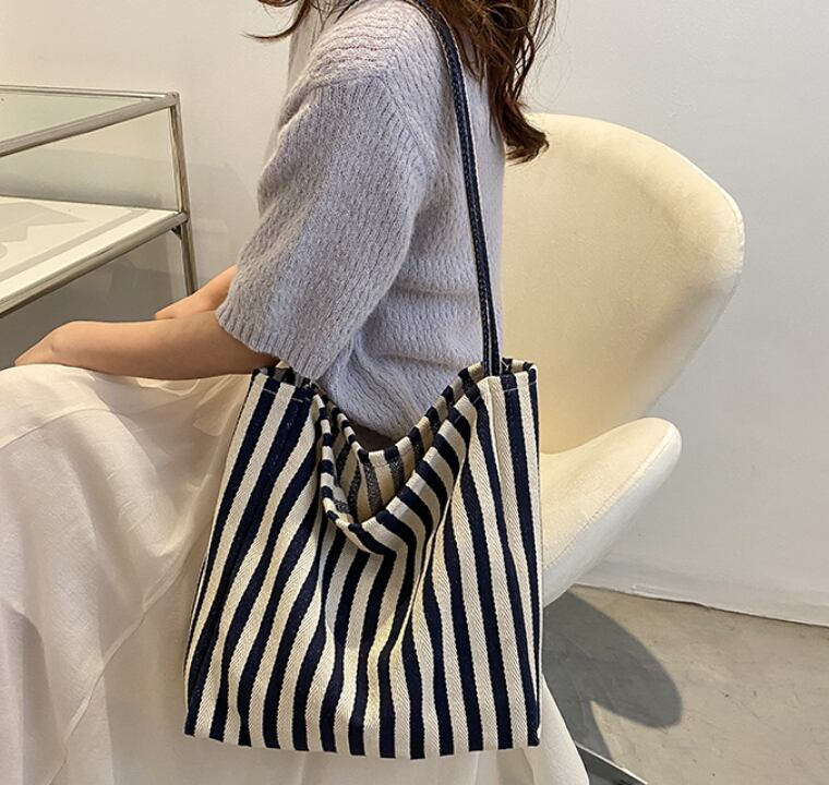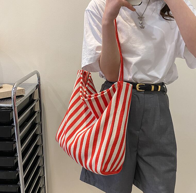 ストライプ柄がファッションのアクセントになるトートバッグ。