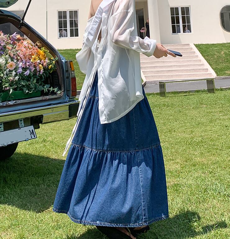 ティアード デニム ロングスカート ロング丈 かわいい カジュアル おしゃれ 大人可愛い ラフ キュート ガーリー 春 夏 通勤 通学 お出かけ リゾート 旅行 普段使い 楽ちん 体系カバー M L XL 2XL 3XL 4XL 青 ブルー AS10350