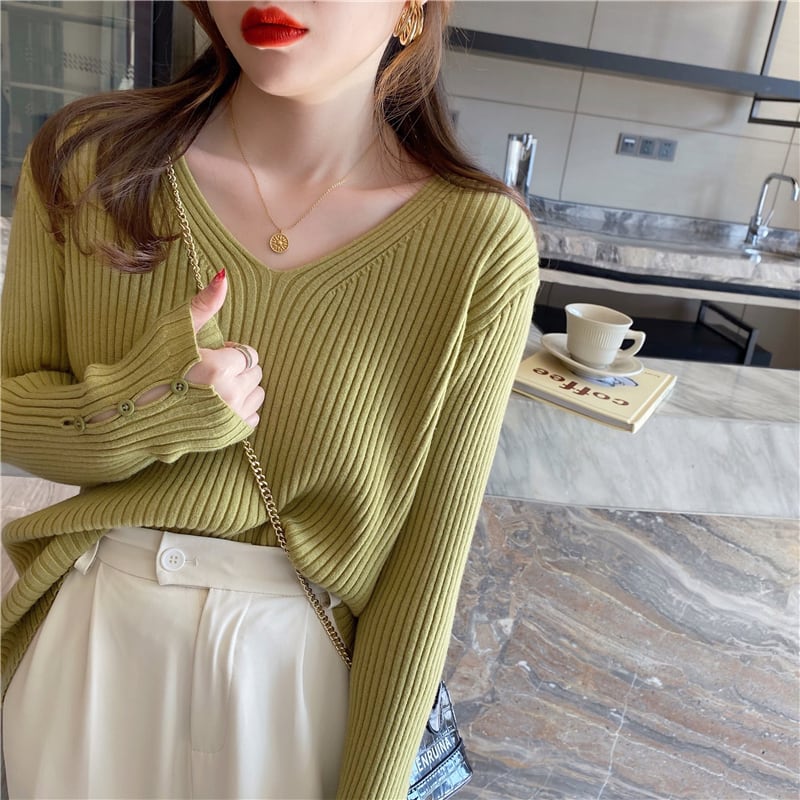 袖口のボタンデザインがアクセントのリブニットトップス。